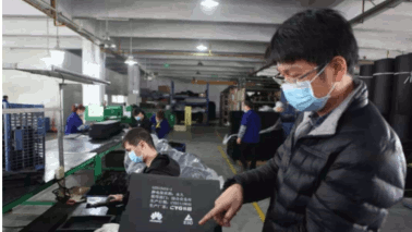 高大的车间里,一名女工右手拿着一条燃气火枪,火枪里呼呼地吐着蓝色火苗,左手戴着手套拿起一块黑色的泡沫,…