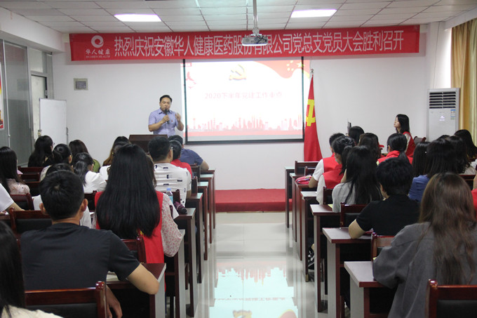 6月28日下午,为庆祝中国共产党成立99周年,进一步践行“不忘初心、牢记使命”主题教育,贯彻党的十九届四中全会重要精神,安徽华人健康医药股份有限公司在集团总部会议室召开了2020年中党员大会,华人健康集团党员、积极分子等60余人参加本次会议,省委党校党建教研部胡珺副教授、包河经开区益企党群中心副主任许阳同志应邀出席。