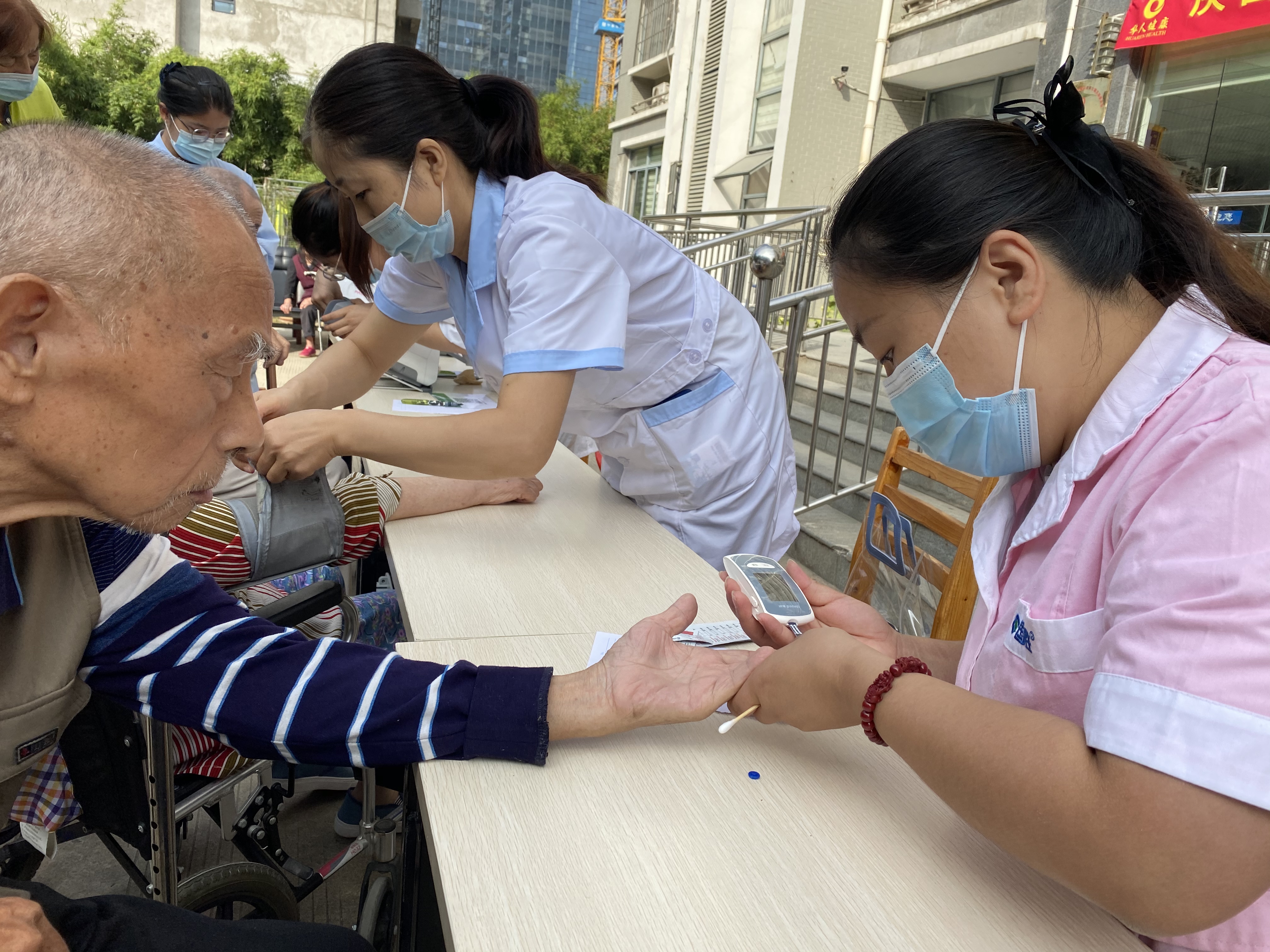 9月29日上午8时,体测义诊活动正式开始。本次义诊主要为老年朋友们提供心脑血管和视网膜检测,量血压、测血糖,义诊现场井然有序,志愿者耐心细心地询问他们的身体状况、日常饮食以及用药情况,根据检测结果有针对性地为老人们提供专业的用药指导。