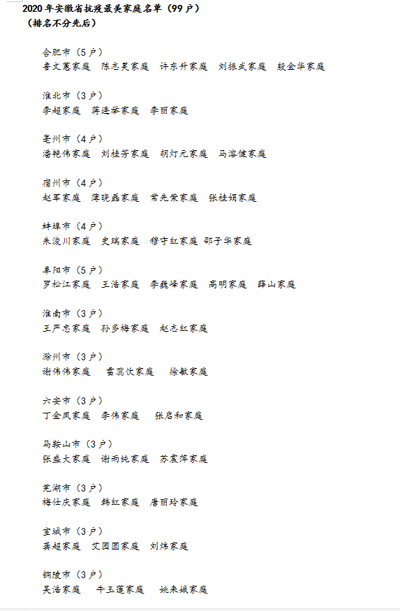 自新冠肺炎疫情发生以来,全省广大家庭积极参与疫情防控,涌现出许多表现突出的家庭典型。为表彰广大家庭成员在疫情防控中展现出的忠诚履职、勇于奉献、舍小家为大家的家国情怀,进一步弘扬社会主义文明新风尚。5月26日,由省妇联主办的“皖家传大爱共筑家国梦”安徽省抗疫最美家庭揭晓仪式在合肥举办,何家乐家庭等99户被授予“抗疫最美家庭”称号。